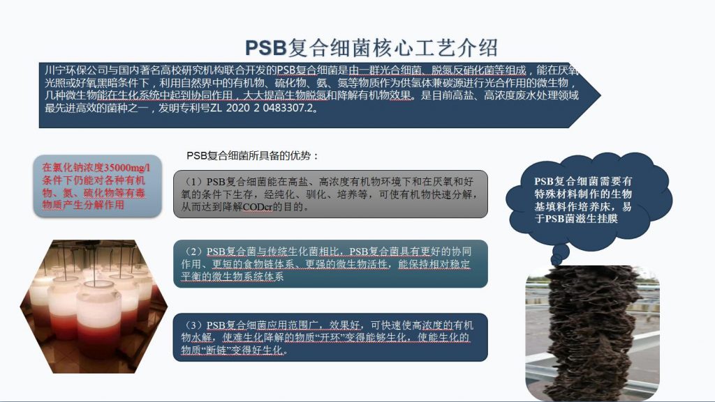 川寧環(huán)保公司與國內(nèi)著名高校研究機構(gòu)聯(lián)合開發(fā)的PSB復(fù)合細菌是由一群光合細菌、脫氮反硝化菌等組成,能在厭氧光照或好氧黑暗條件下,利用自然界中的有機物、硫化物、氨、氮等物質(zhì)作為供氫體兼碳源進行光合作用的微生物,幾種微生物能在生化系統(tǒng)中起到協(xié)同作用,大大提高生物脫氮和降解有機物效果。是目前高鹽、高濃度廢水處理領(lǐng)域最先進高效的菌種之一,發(fā)明專利號ZL 2020 2 0483307.2。